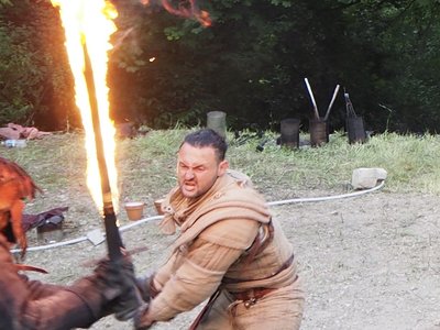Grâce au travail de terrassement de Jean D'Arc - un membre de la compagnie - son terrain se portait bien à ce type d'exercice. Mais pour cela il a fallu mouiller la chemise pour rafraichir le terrain, le rendre praticable et le préparer aux combats à l'épée, au spectacle de feu et bien évidemment à l'accueil du public.